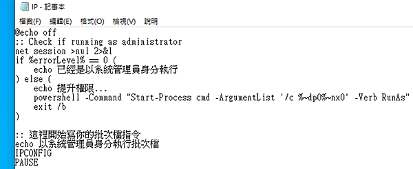 可以在批次檔裡加入一段代碼,檢查當前是否以系統管理員身份執行,如果不是,則用 PowerShell 重新以系統管理員身份啟動。