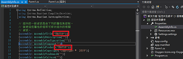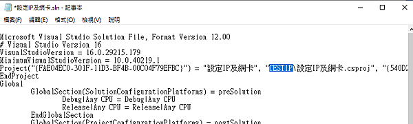將記事本內所有之前專案名稱的全部改掉。我之前的名稱為"TESTIP"要改為"設定IP及網卡"。